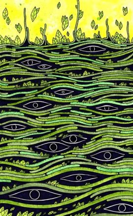 - the green leaves hiding his balding head.